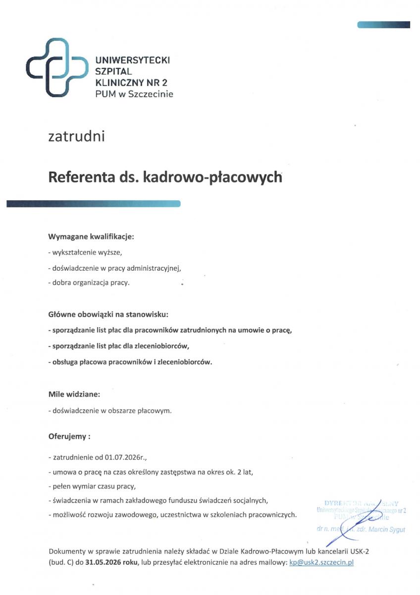 Oferty należy składać w zamkniętych kopertach w Dziale Kadrowo-Płacowym USK-2 w terminie do dnia 24 kwietnia 2026 r. do godz. 12:00.