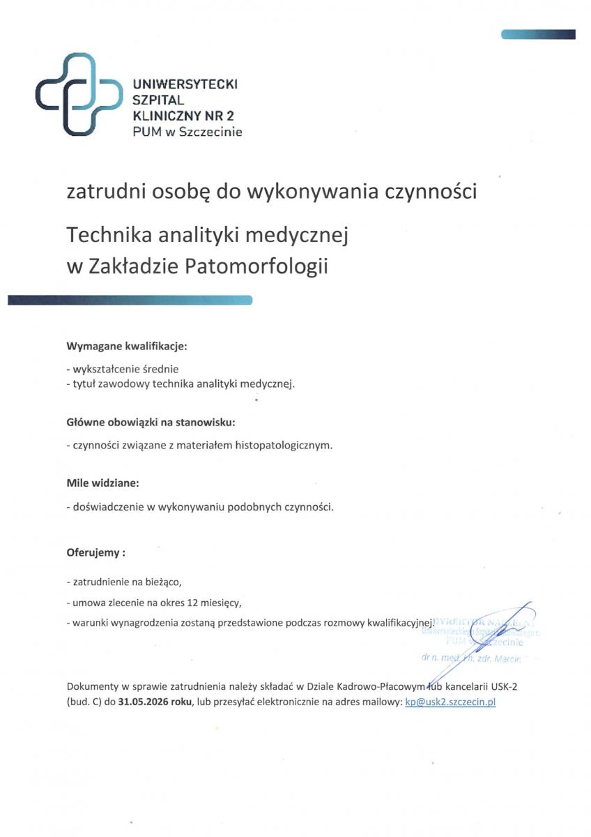 Formularze ofert wraz z załącznikami można pobierać w Dziale Kadrowo-Płacowym USK-2 od poniedziałku do piątku w godzinach 8:00 – 14:30, od dnia 15 kwietnia 2026 r.