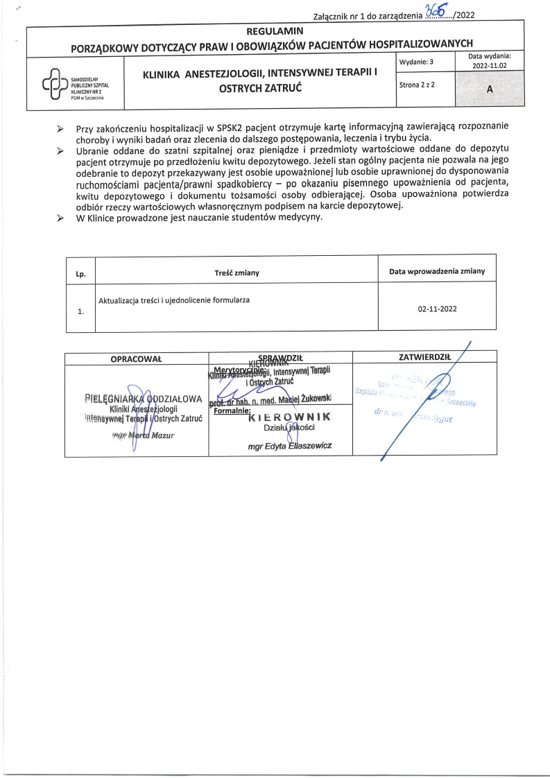 Zakres świadczeń wykonywanych u Pacjentów leczonych w Klinice Anestezjologii, Intensywnej Terapii i Ostrych Zatruć USK-2: