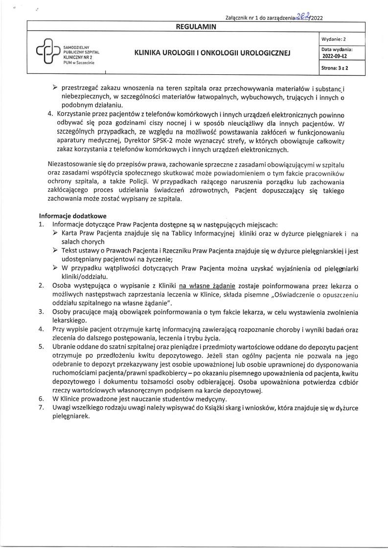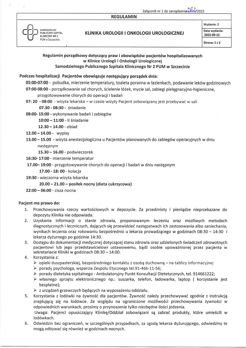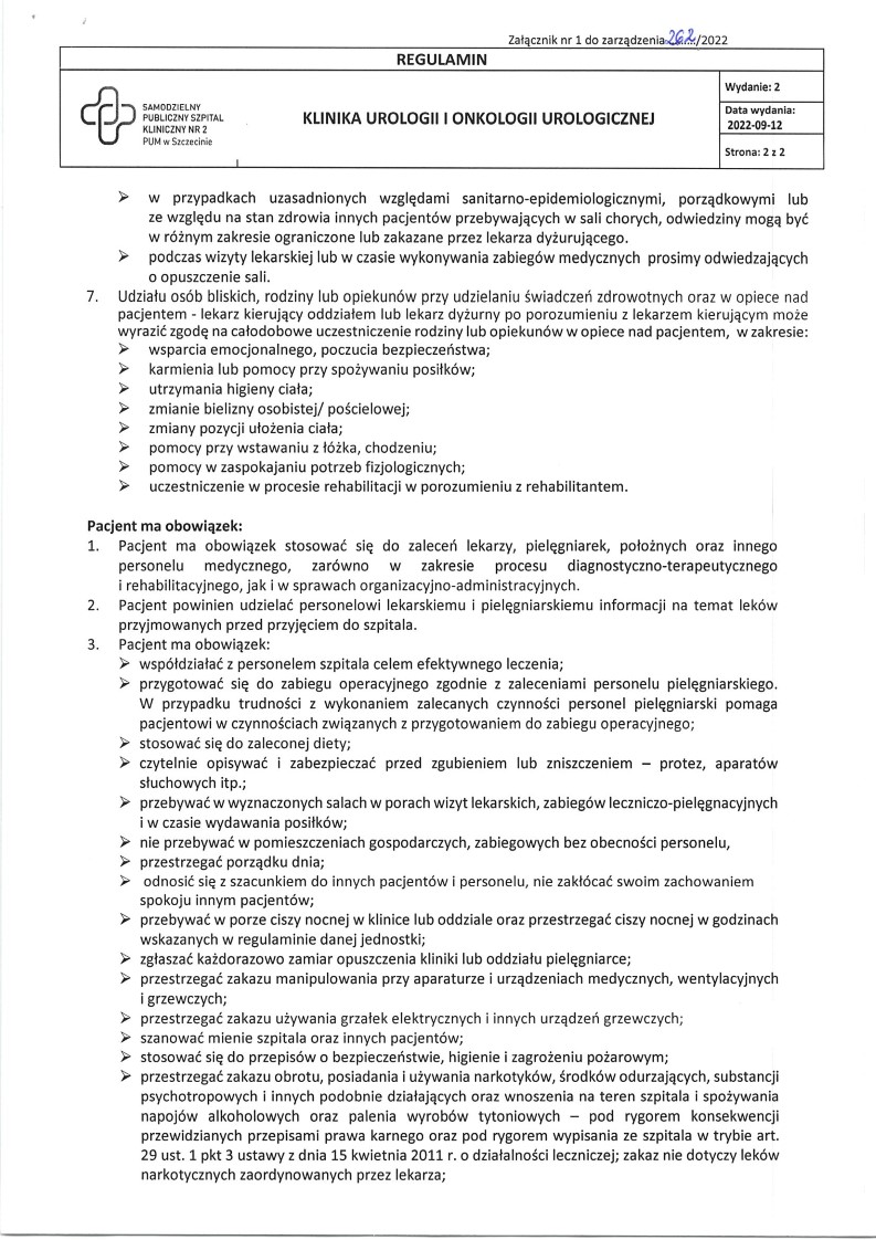 Do Kliniki Urologii i Onkologii Urologicznej USK-2 przyjmowani są Pacjenci celem leczenia planowego oraz w trybie doraźnym. Do planowej hospitalizacji pacjent powinien zgłosić się we wskazanym dniu na Izbę Przyjęć Chirurgiczną (bud. F), w godz. 7.30-8.00. Nie ma potrzeby być na czczo. Należy wziąć ze sobą: