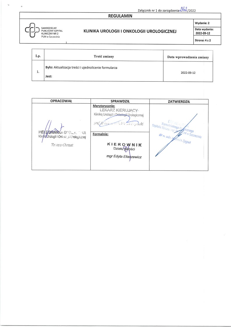Klinika Urologii i Onkologii Urologicznej USK-2 jako jedna z niewielu w kraju otrzymała certyfikat jakości szkolenia przyznany przez Europejską Radę Urologii (European Board of Urology) potwierdzający m.in., że wytyczne europejskich towarzystw naukowych są również podstawą naukową postępowania lekarskiego stosowanego w Klinice zgodnie z najbardziej aktualną wiedzą medyczną. Jakość organizacji pracy oddziału potwierdza także certyfikat ISO. Prowadzona jest stała analiza osiąganych przez zespół Kliniki wyników oraz występujących zdarzeń niepożądanych. W porozumieniu ze służbami epidemiologiczno-mikrobiologicznymi stosujemy najsurowsze standardy kontroli i zapobiegania zakażeniom wewnątrzszpitalnym, które dzięki temu należą do rzadkości.