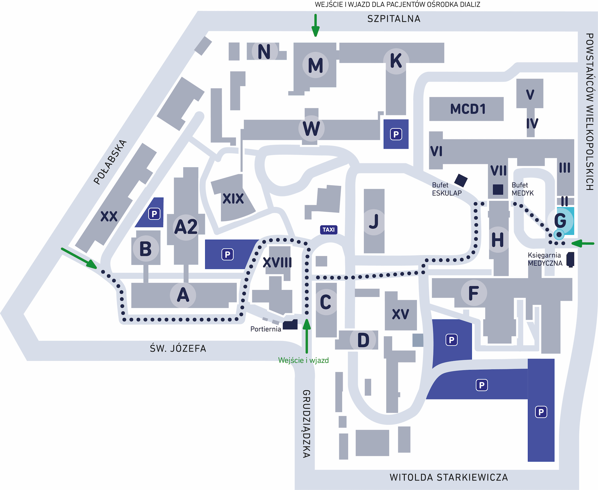 Bud. G (budynek Przychodni Przyklinicznej) – najbliższe wejście bramą od al. Powstańców Wielkopolskich (otwartą w dni powszednie w godz. 6.00-20.00) lub bramą główną od ul. Św. Józefa,